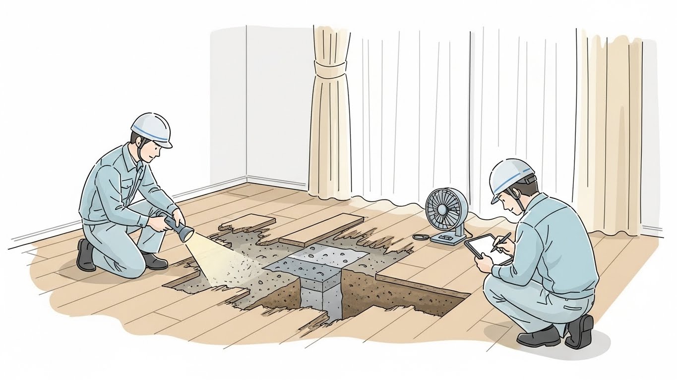 床下浸水・床上浸水・雨漏りなどで濡れた下地・断熱材・構造材をきちんと確認し、