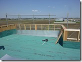 防水ルーフィング23k長手方向パラペット立ち上がり部より重ね代に注意をして ガルバ金属板を真物を通し貼りしています。雨仕舞いを充分に注意をした施工です 下屋の施工の様子です。こちらからは金属縦葺屋根の施工です吊子部分が一…