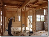 こちらが無垢36㎜杉板のJパネルを工場でオーダー加工されたオーダーメイド製品を落とし込み構法で立て込んでる所 (一枚のパネル材です) 無垢杉の三層構造です正目を相対に使い挟み込み実の強度も確保しています 床そのまま使った…