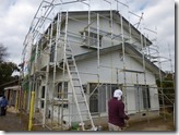 塗装工事前の様子です足場が掛かり下準備ん入りました初めに傷んだコーキングを 剥離工事のため養生テープを貼り剥離の準備完了 これ何?希望の塗装色を仮塗しています。玄関前の足場養生・出窓はしっかりと養生 しましょう 下屋の屋…