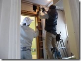 浴室の入口が大きくなったので解体部を補修中の大工さんですそしてこちらK様邸実は 柱と間柱と土台の一部に腐食があったので入れ替へも行っています工細かい所に気を 配って工事をしました。 こちら木工事補修が終わってドアの化粧枠…