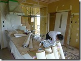 リビング階段の下部これが又狭くて大変面倒な所を2人がかりで収めてくれました 電気屋さん登場スイッチ リモコン配線が集中まとめに入りました・・よろしく!! 天井カセットエアコン取り付け完了・蓄熱暖房機も取り付け完了・続いて…