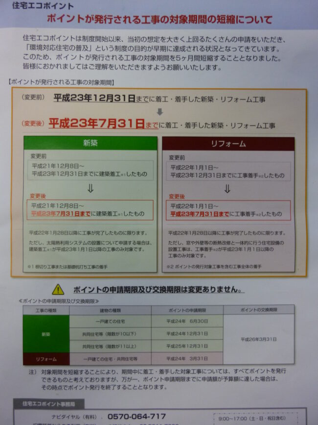 住宅エコポイントの工事の対象期間短縮それます。 短縮される対象期間は・・・…5ケ月間短縮される事になりました。 ポイントが発行される工事の対象期間は次の通りです。 変更前平成23年12月31日…