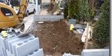 既存ブロック一部解体撤去をして根切り土出し底入れ路盤工が決まり丁張りとレベルあて